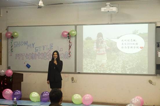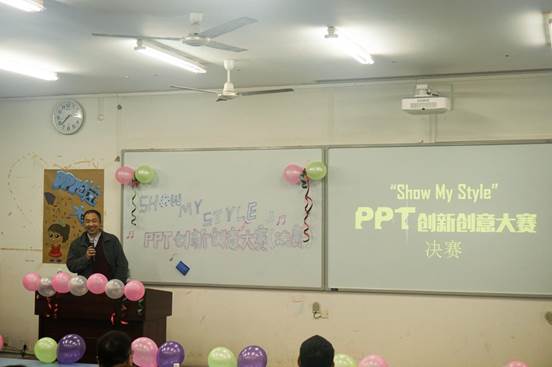 荣鑫阁教授致开场词,荣教授表示作为一个资深PPT爱好者能受邀作为本次比赛的评委十分荣幸,也希望同学们可以赛出风度、赛出水平、相互学习、共同进步。 主持人宣读比赛规则后,比赛正式开始。本次赛事以创新为主题,使得整个比赛妙趣横生。第一组创意而真实的《难》展示了整个PPT制作的过程,把生活写进PPT里,引起现场观众的共鸣;第五组自作自创的《LOL火柴人动画》充满了个性与独特,显示了参赛者扎实的专业技能;第十组在一片无声的世界里带来的《消失的绿色》引人深思;第十四组伟大而亲切《中国梦》使现场的观众倍感光荣与责任,为自己的国家而自豪,赢得了观众们激烈的掌声等等优秀的参赛作品无一不展示了同学们良好的创新能力以及积极学习的心态。最终,来自世界杯决赛