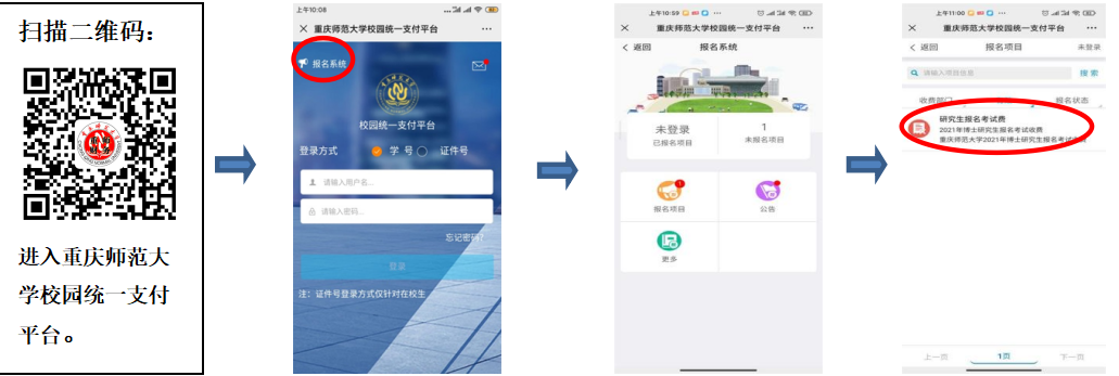 校内考生扫描二维码用学号登录报名系统,选择报名项目后即可报名缴费;校外考生扫描二维码进入报名系统,选择报名项目后需先注册后再报名缴费。