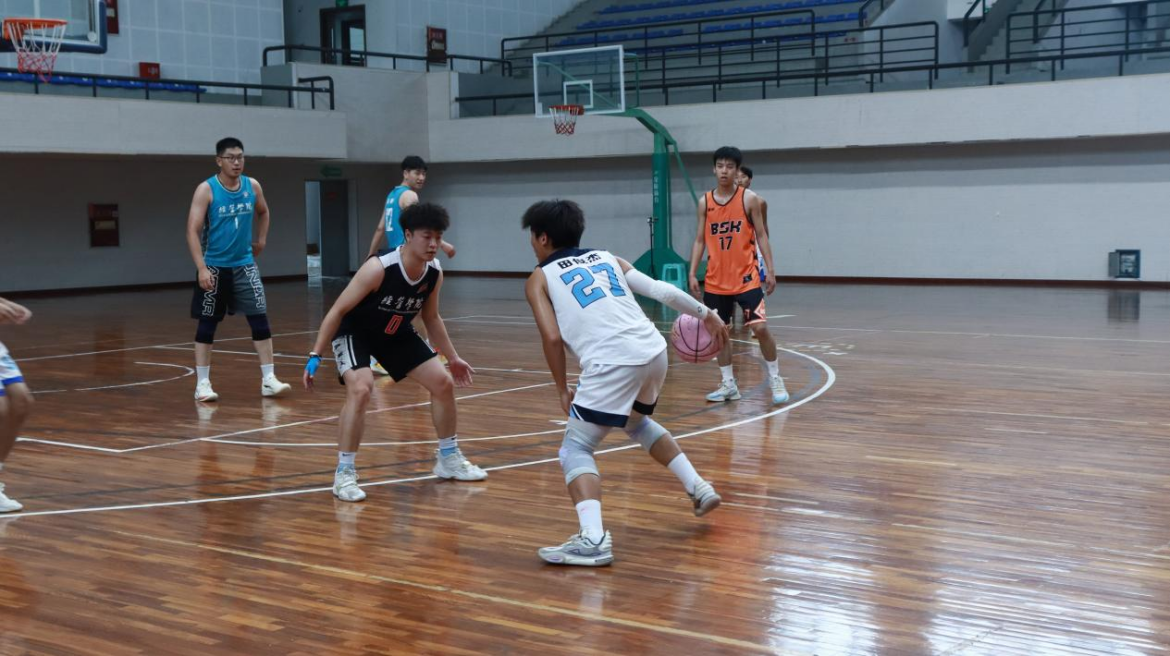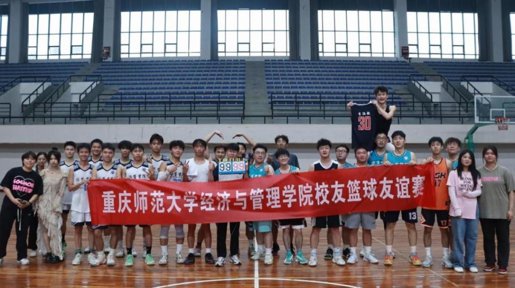 校友之间的篮球友谊赛。在2024年6月10日下午两点半,体育馆二楼篮球馆内,现役校篮球队与17级工商管理校友陈杰巍、张庆源,18级金融工程校友牟俊霖、张太校,19经济世界杯决赛
