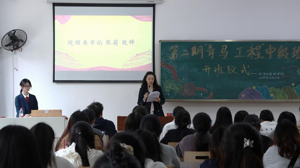 在齐唱中国共青团团歌后,张莉老师上台致辞,着重强调了青马工程的重要性和深远意义,表达了对同学们的殷切嘱托,希望大家在中级班能够深度研读马克思主义理论,既要继承前人的智慧结晶,又要保持自身独立思考能力,将所学到的理论知识转化为促进社会进步和发展的实际行动。