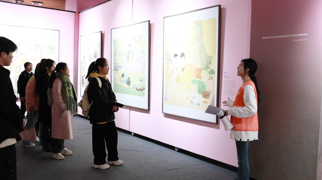 师生、校友、离退休老同志的美术、书法作品,文创产品,视频影像等为载体,从细腻的书法到别具一格的装置艺术,从历史文物到富有创意的文创产品,丰富多样的展品让同学们目不暇接,沉浸于各类艺术作品所营造的独特氛围之中。