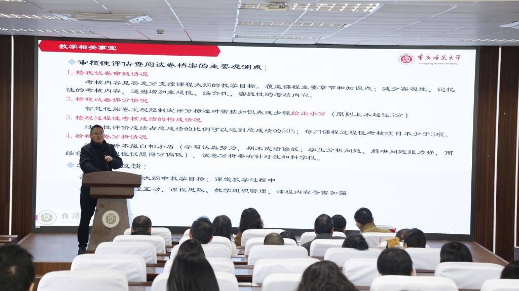 副院长段俊针对教学质量提升工作,从审核评估的角度出发,分享了试卷档案管理与实验课程考核等方面的经验做法,并强调了持续优化教学流程、确保各项教育活动合规开展的重要性。