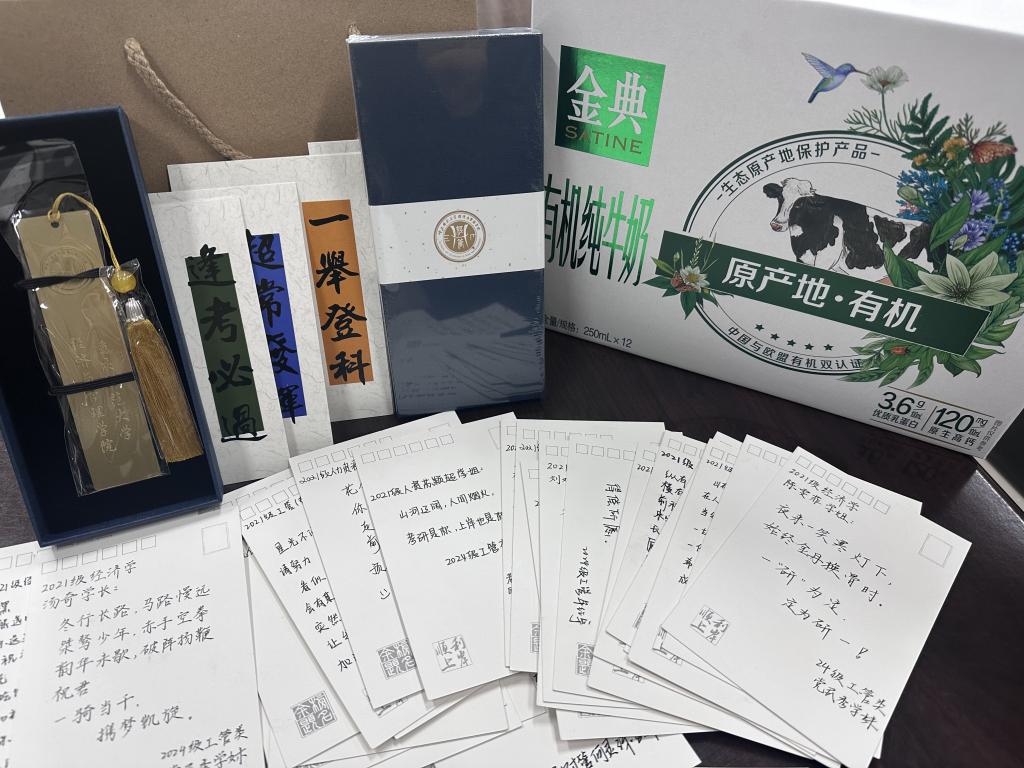 随后,各位领导为考研学子发放了精心准备的慰问礼包,寓意着对他们“能量满满、学思顺遂”的美好期许。