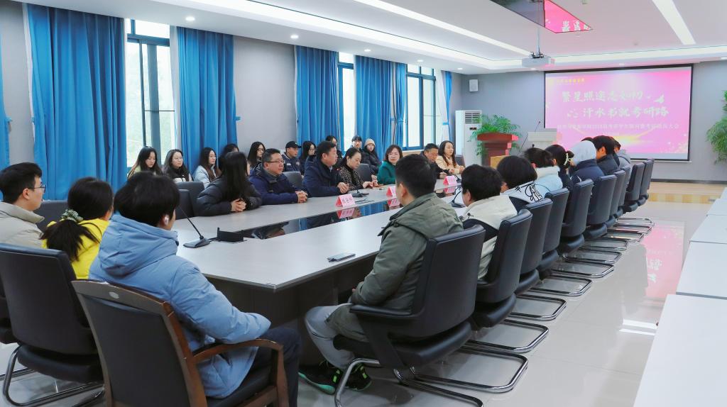 全体党政领导和毕业年级辅导员与考研学生代表齐聚一堂,为考研学子加油鼓劲。