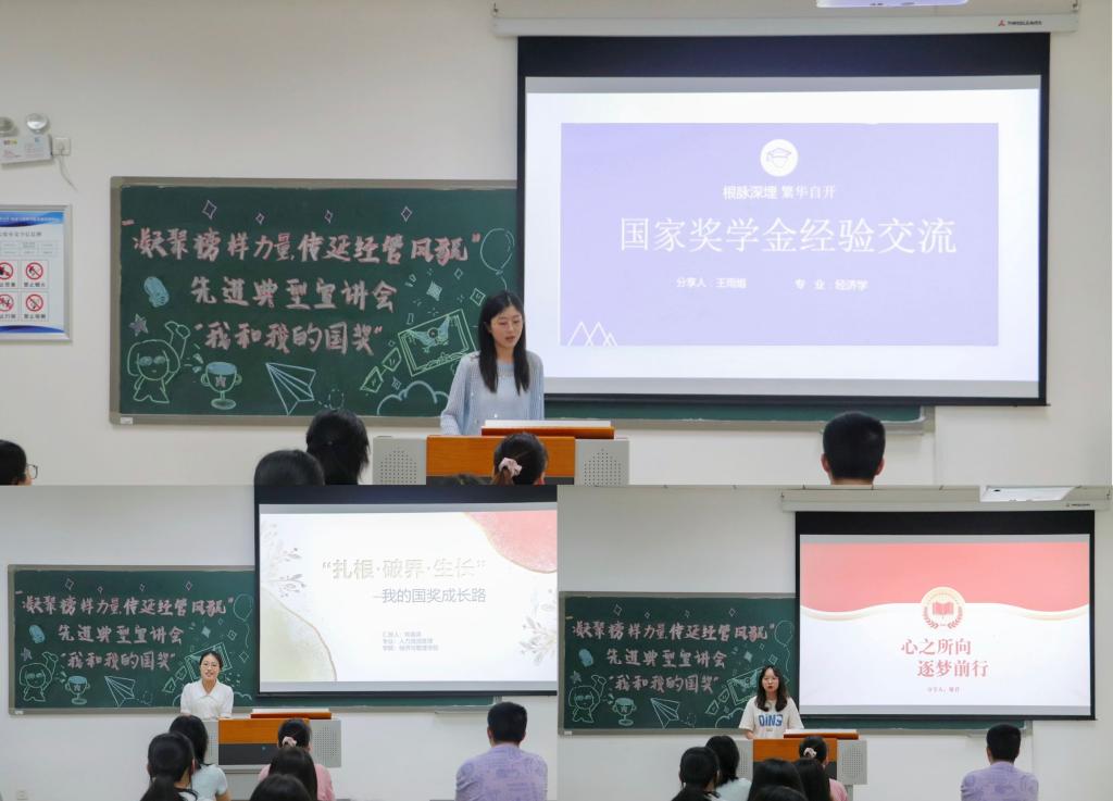 于求是楼215举办“凝聚榜样力量,传延经管风貌”先进典型系列宣讲会——“我和我的国奖”。本次活动邀请王雨熔、熊嘉英、谢君三位国家奖学金获得者担任分享人,世界杯决赛