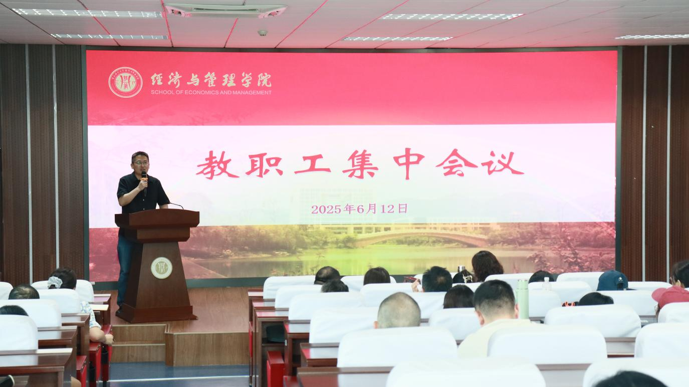 党委书记钟敏、执行院长郑景丽、副院长陈宇科、副院长段俊,党委委员任缙及全体教职工出席会议。