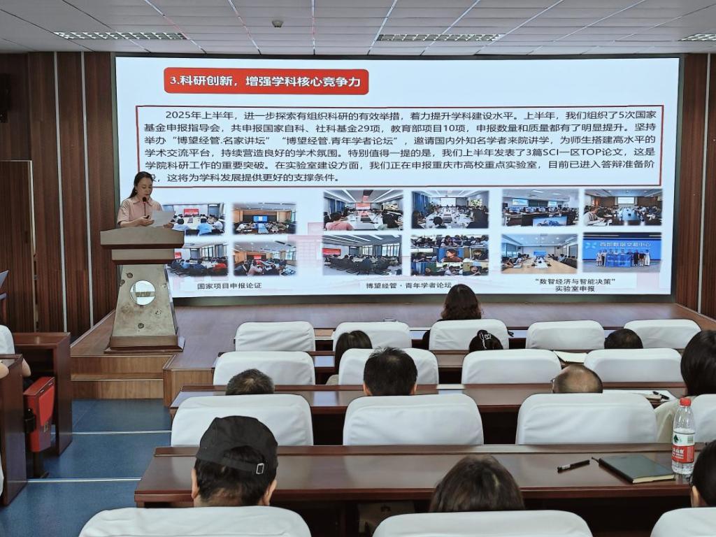 在党建、教学、科研、学生管理等方面取得显著成绩。党建方面,深入学习贯彻党的二十大和二十届三中全会精神,推进提级巡察整改,强化纪律意识;教学上,完成本科教育教学审核评估,荣获重庆市高校教师教学创新大赛一、二等奖,修订完成人才培养方案,线上线下创新招生宣传等。科研上,申报国家基金项目29项,发表3篇SCI一区TOP论文,筹备申报重庆市高校重点实验室等。学生管理上,强化思想教育,保障安全稳定,2025届本科毕业生就业率达91.33%。暑期将持续推进巡察整改、开展数字化素养培训、筹备新文科实践创新大赛、拓展就业机会、组织暑期三下乡实践活动、支持教师学术交流等工作。未来,世界杯决赛