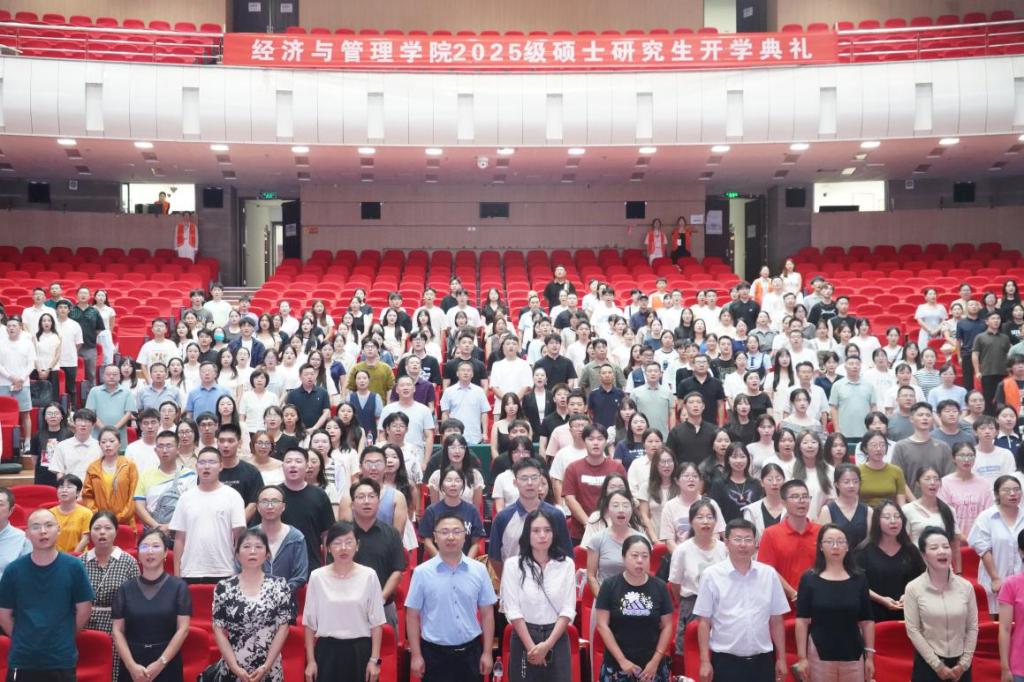 党政领导、研究生导师、研究生办公室老师及2025级全体硕士研究生齐聚一堂,副院长陈宇科主持。