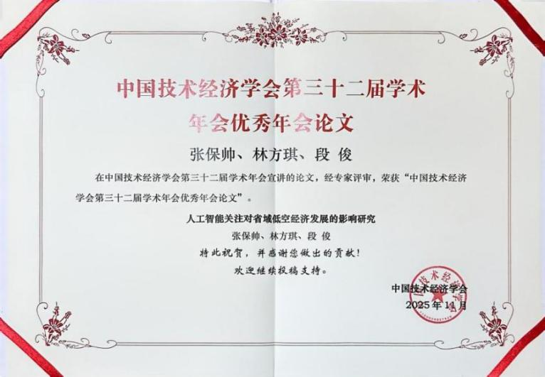 在张保帅教授、段俊教授指导下,林方琪同学完成的论文《人工智能关注对省域低空经济发展的影响研究》,从人工智能技术与低空经济融合的视角出发,系统探讨社会公众人工智能关注度对省域低空经济发展的影响机制与路径,兼具理论深度与现实指导意义。论文选题前沿、研究方法严谨规范、结论具有创新价值,受到分论坛主持人与点评专家的高度评价。