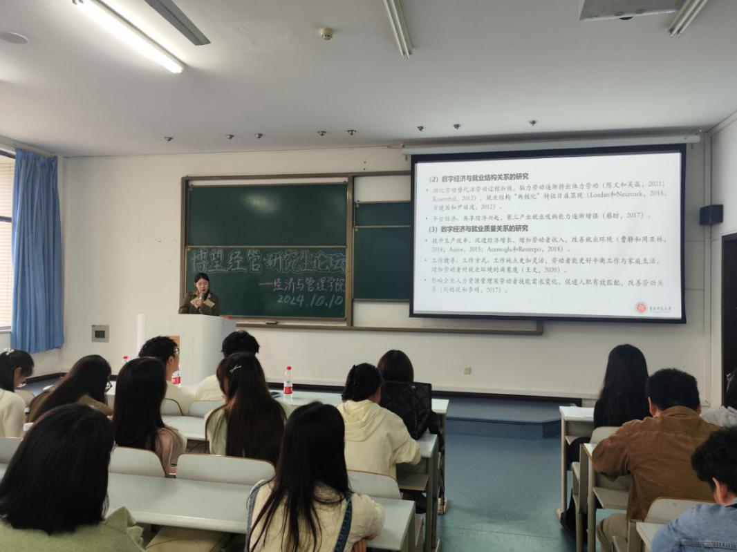 何瑾同学分享了一篇自己的工作论文,她根据自己的切身体会,讲述了论文选题技巧,例如她的论文主题“创造抑或替代:数字经济对农民工就业的影响”,即是将自己对于数字经济的兴趣与农业管理专业结合在一起,体现了她在论文写作中的创新思维。她提到,论文写作不仅是对知识的总结,更是对新观点的探索。她鼓励大家在写作过程中勇于提出自己的见解,并通过实证分析来支撑自己的观点。