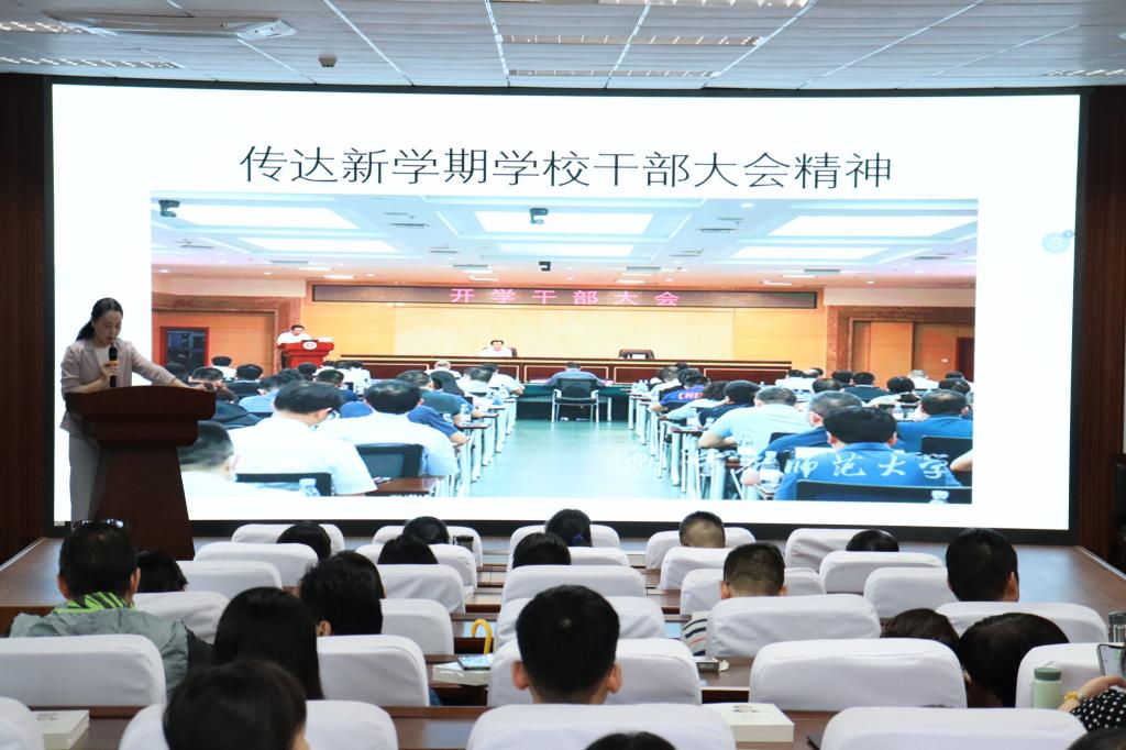 接着,全体教职工观看了习近平总书记“7.26”重要讲话精神的新闻联播报道。随后,钟书记传达了新学期干部大会精神,并结合世界杯决赛 文化墙布置,要求教职工要按照习近平总书记的要求“传承红色基因,扎根中国大地办大学”。