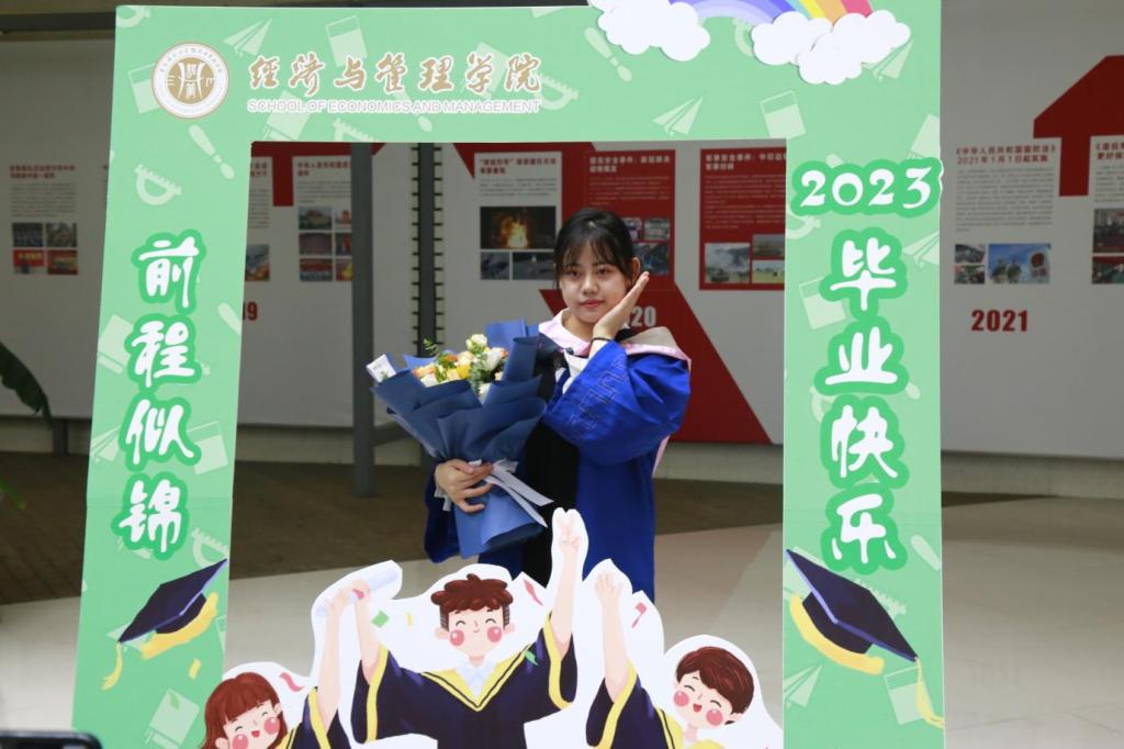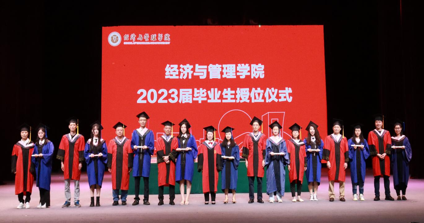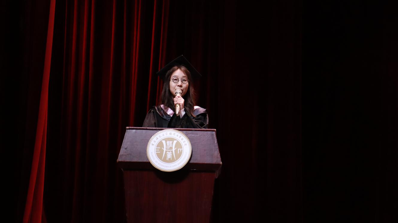 共话拳拳师者心,殷殷诉别桃李情。教授代表陈绍友教授深情寄语2023届全体毕业生,希望他们在未来的日子选择平和与沉淀、大气与作为、健康与友善,永葆赤子之心,砥砺使命担当。执行院长郑景丽教授发表致辞,她向圆满完成学业的2023届毕业生表示衷心的祝贺,同时对即将远航的毕业生们提出期望:一是厚植家国情怀,勇担使命,争做堪当民族复兴重任的时代新人;二是笃定目标,脚踏实地,勇于做难事,勤于做实事;三是终身学习,知行合一,保持旺盛的求知欲,用持续学习提高竞争力。拨穗正冠,学有所成。学位评定委员会成员为2023届全体毕业生拨穗正冠,颁发学位证书并合影留念,至此毕业典礼落下帷幕。