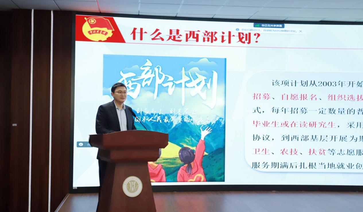 志愿者故事分享和求职经历与职业生涯规划分享等方面展开讲述。他提到,人才流动工程旨在吸引中西部地区的孩子回到家乡,通过信息化管理,使其在当地能充分发挥自身才能,得到良好发展。同时,他强调西部计划始终以公开招募、自愿报名、组织选拔、集中派遣的方式,进行一年一签,具备一定的政策红利,在多省联动的背后,也一定程度上缓解了大学应届毕业生就业压力。除此之外,他指出,应届毕业生在选择服务地区时应按照“动机和意愿第一,身体状况为先”的原则,勤加关注各项目办消息,并以近十年来西部计划报名、派遣人数的详细数据和学长学姐的经历经验为例,建议学生应重视实践、知行合一、端正态度、精准定位,希望其在社会的广阔天地大显身手。