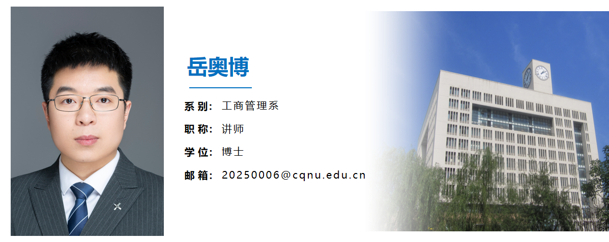 岳奥博,男,重庆大学管理科学与工程专业博士,讲师,中共党员,硕士生导师(招收“农业管理”专硕)。主要致力于大数据挖掘与公众行为分析、智慧城市建设与创新治理、关键基础设施韧性数智化治理。以第一作者或通讯作者在Technological Forecasting & Social Change(ABS 3*,IF=13.3)、Sustainable Cities and Society(Top期刊,IF=12.0)、Ecological Indicators(IF=7.0)和城市发展研究等高水平期刊发表学术成果17篇,其中SCI/SSCI/CSSCI 10篇。入选中国科协科技智库青年人才计划(2021年)。主持中国科协智库青年人才项目、重庆市技术预见与制度创新项目、重庆市社科规划项目、重庆市教委人文社科项目、重庆市教委科技项目等省部级课题5项,参与国家社科基金项目、教育部人文社科、重庆社科规划重大项目等省部级及以上项目10余项。担任Energy Efficiency、Ecological Indicators、Asia Pacific Journal of Marketing and Logistics等多本SCI/SSCI的期刊审稿人。讲授《大数据技术原理及应用》、《大数据可视化分析》、《管理学原理》、《社会网络分析》等课程。