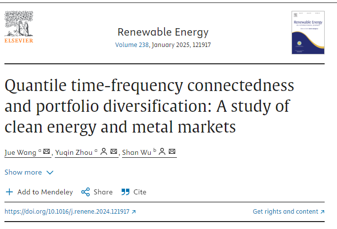 王珏副教授撰写的论文Quantile time-frequency connectedness and portfolio diversification: A study of clean energy and metal markets在Renewable Energy公开发表。