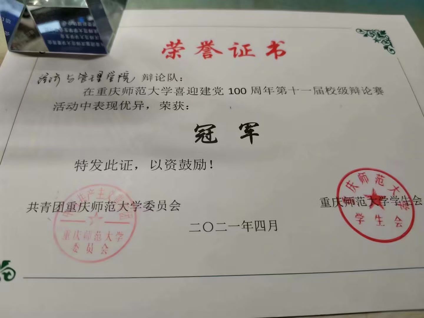 辩论队荣获“喜迎建党100周年第十一届校级辩论赛”决赛冠军)