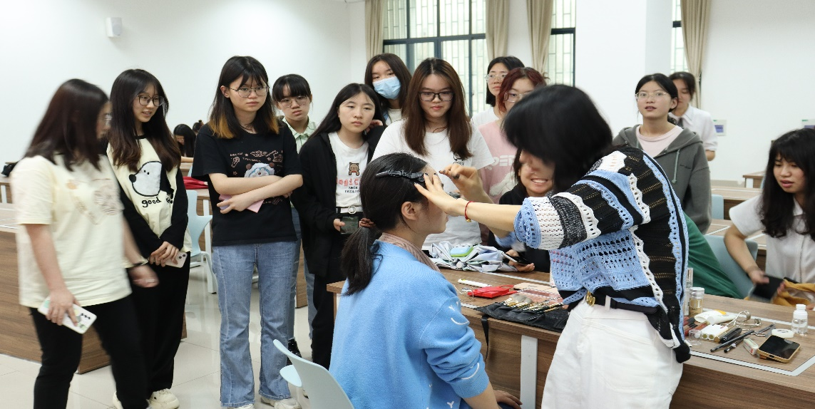 培训会上,龙丽君老师结合自身职场经历从个人形象的重要性、职业形象与礼仪、职业妆容四个方面进行了详细地讲解。她指出在现今时代是“颜值时代”,个人形象塑造是个人的修养,好的形象会为求职者带来更多的机会。同时,她细心地提醒同学们面试中的礼仪不仅是着装礼仪,更是谈吐礼仪、举止礼仪和情绪礼仪。为了让同学们更加清晰地了解如何塑造自身形象,龙丽君老师选择了一名同学作为模特进行现场化妆演示并针对化妆的正确步骤以及妆容与服饰的搭配进行了细致地剖析。