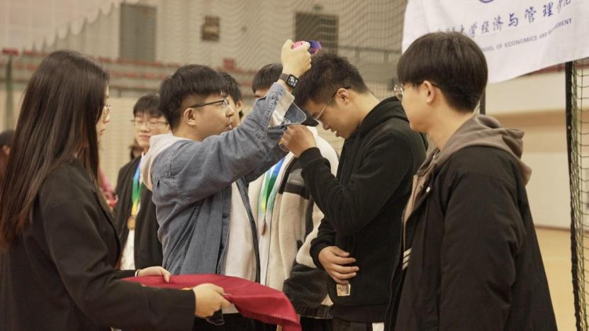 随着裁判员一声令下,22级工商管理类3、4班和20级工商管理的球员们斗志昂扬,火力全开。双方球员密切配合,以敏捷的跑位,漂亮的传球,精准的投篮赢得了场外呐喊喝彩不断。最终20级工商管理以81:61的比分赢得冠军。赛后,丁延昭老师和李威老师为球员们颁奖,全体人员合影留念,至此,本次世界杯决赛 “迎新杯”篮球赛圆满结束。